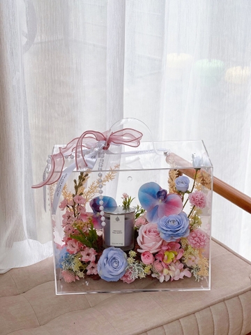 Thiết kế giỏ hoa mica trong suốt của Mơ Bơ sẽ là một món quà tinh tế dành tặng người thân yêu của bạn. Món quà tựa như một vườn hoa mùa xuân thu nhỏ, dễ cầm theo và đem tặng.